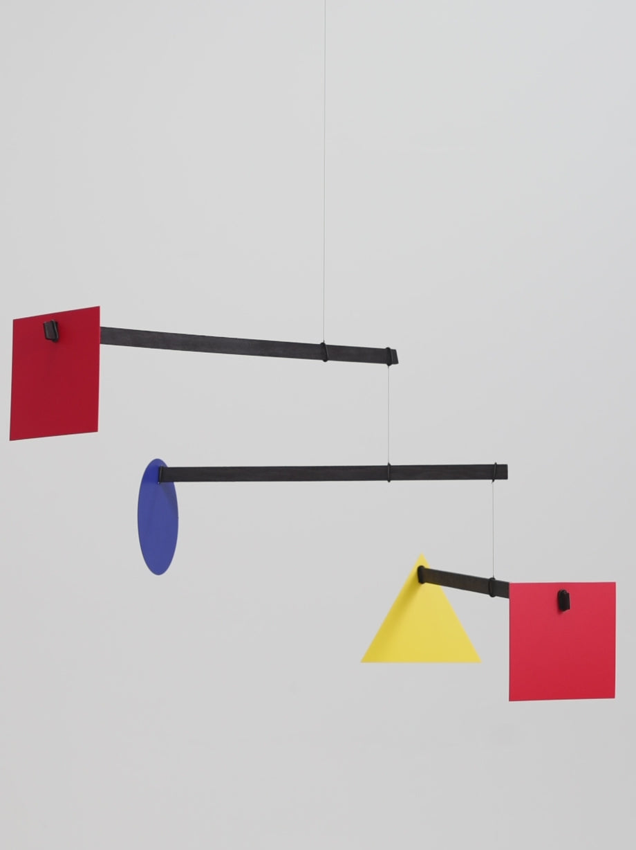 Inspired by the Bauhaus Museum in Weimar, this hanging mobile captures the movement's iconic aesthetic with primary colours and geometric forms. A refined addition to any room, be it living space, bedroom, hallway, or kitchen. Celebrating modernist design excellence.